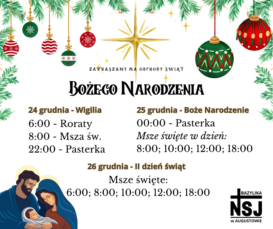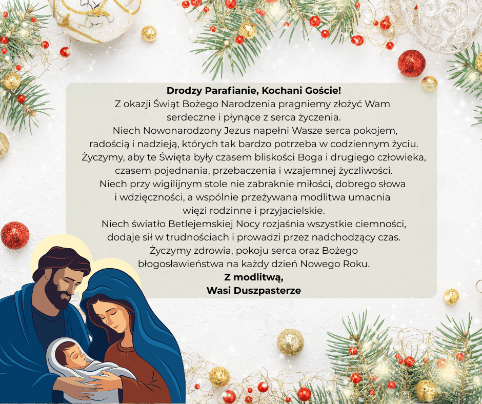 4. W najbliższy czwartek, 1 stycznia, z Maryją, Bożą Rodzicielką wejdziemy w Nowy Rok Pański 2026. Tego dnia w szczególny sposób będziemy modlili się o pokój na świecie. Porządek mszy świętych w naszym kościele: 8:00, 10.00, 12.00 i 18.00.